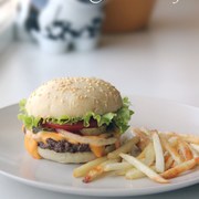 牛肉馅、生菜、西红柿、洋葱、酸黄瓜、自制汉堡胚、芝士、千岛酱、番茄酱、黑胡椒粉。