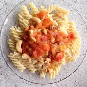 意大利面、鸡丁、西红柿、洋葱丁、腰果、葱花、西红柿酱。