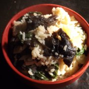 大米、腊肉、鲜肉、上海青白菜、干虾仁、干鲜贝、大葱、食用油、生抽、盐。