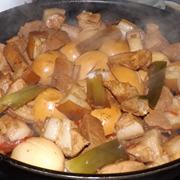 三黄鸡、土豆、洋葱、灯笼椒、干辣椒、花椒。