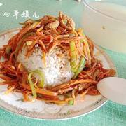 青椒、胡萝卜、细笋、肉猪肉、韩国蒜蓉辣酱、老抽、盐、味精、葱花、姜末。