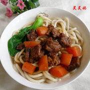 牛肉、面条、胡萝卜、青菜、冰糖、葱段、姜片、花椒、八角、桂皮、香叶、辣椒、生抽、料酒、胡椒、醋。