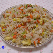 米饭、火腿、鸡蛋、玉米粒、胡萝卜、虾皮、葱花、盐。