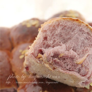 高筋粉、紫薯粉、面包改良剂、盐、白砂糖、黄油、水、奶粉、蛋液、杏仁片、蔓越莓干。