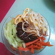 面条、五花肉、鸡蛋、黄瓜、胡萝卜、香菇、木耳、虾皮、西红柿、黄豆酱、甜面酱、蚝油、醋、糖、胡椒粉、五香粉、花椒粉、葱。