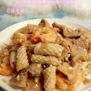 猪里脊、大虾仁、鱿鱼、黄酒、盐、蒜、葱、姜、淀粉、白胡椒粉。