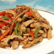 牛里脊、茶树菇、红菜椒、绿菜椒、葱、姜、蒜、蚝油、黄酒、酱油、盐、白砂糖、花生油、蛋清、淀粉、白胡椒粉。
