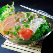 米线、番茄、平菇、猪肉、火腿肠、香葱、油菜、蚝油、盐、鸡油。