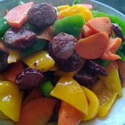 青椒、黄灯笼椒、胡萝卜、辣腊肠、葱油、鸡精。