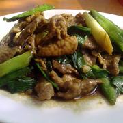 猪瘦肉、大葱、植物油、料酒、蚝油、酱油、盐、鸡精、淀粉、香油、白糖。
