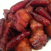 猪五花、干辣椒、葱、姜、料酒、盐、糖、鸡精、五香粉、八角、红烧酱油。