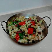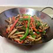 茶树菇、五花肉、青椒、红椒、葱段、姜片。