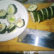 米饭、海苔、鸡蛋、牛油果、熟虾仁、墨鱼、芝麻。