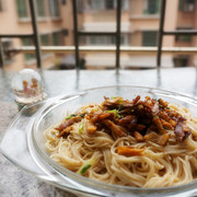 挂面、肉丝、香菜、番茄酱、生油、盐、酱油、沙拉芝麻汁。