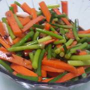 蒜苔、胡萝卜、盐、白糖、醋、酱油、花椒、蒜。