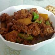 猪肋排、土豆、蘑菇、青椒、鸡蛋、面粉、盐、白糖、料酒、酱油、鸡精、葱、姜、蒜。