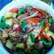 三黄鸡、红菜椒、绿菜椒、土豆、洋葱、盐、鸡精、白糖、郫县豆瓣、啤酒、大料、炖肉调料、花椒。