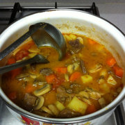 牛里脊肉、土豆、番茄、洋葱、口蘑、胡萝卜、伏特加、黄油、盐、胡椒、罗勒叶、香芹、肉汤、姜片、橄榄油。