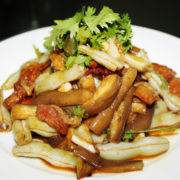 茄子、猪五花肉、姜、葱、蒜、烧焖酱汁。