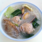 兴化米粉、香菇肉丸、花蛤、炸带鱼、炸鱿鱼、上海青、鸡蛋、盐、油、鸡精、味精。