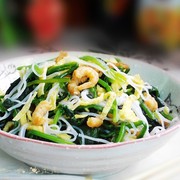 菠菜、鸡蛋、粉丝、海米、盐、油、蒜末、鸡精、醋。