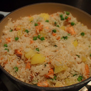 三文鱼、青豆、土豆、大米、小米、万字酱油、盐、黑胡椒。