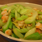 芹菜、虾仁、腰果、生抽、盐、黑胡椒、白酒。