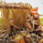红薯粉条、彩椒、瘦肉、葱、姜、蒜、花生油、盐、味精、五香粉、老抽。