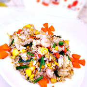 剩米饭、玉米、胡萝卜、虾仁、青豆、火腿、鸡蛋、韭苔、盐、鸡精、花生油、葱花。