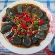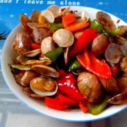 花蛤、青辣椒、香葱、姜丝、蒜、红辣椒、料酒、盐、糖、老抽。