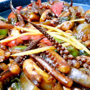 鱿鱼须、青椒、红椒、洋葱、盐、甜面酱、韩式辣酱、黑胡椒粉、玉米油。