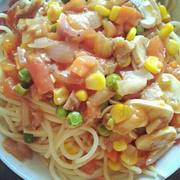 意大利面、蘑菇、肉末、洋葱、西红柿、胡萝卜、玉米。