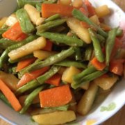 土豆、豆角、胡萝卜、盐、老抽、鸡精。