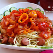 意大利通心粉、火腿、洋葱、西红柿、小黄瓜、彩椒、番茄酱、意大利沙拉酱、盐。