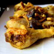 鸡腿、猪肚丝、香菇、盐焗鸡粉、鹹三蒸酒、姜黄粉、白胡椒粉、油、香油。