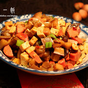 紫色茄子、火腿、白香干、葱、盐、生抽、海鲜酱、香辣脆、海底捞火锅底料、麻油。