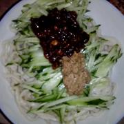 面条、黄瓜、香其酱、鸡蛋、蒜、麻酱。