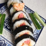 大米、烤肠、蛋卷、黄瓜、肉松、虾、寿司醋、白糖。