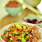 米饭、里脊肉、水发香菇、黄瓜丁、胡萝卜丁、豌豆、盐、葱花、加饭酒、美极鲜、生抽、黄豆酱、蚝油、香油、鸡粉、淀粉。