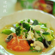 皮蛋、咸鸭蛋、丝瓜、绿豆芽、口蘑、西红柿、金针菇、青菜、青豆、西兰花、葱姜蒜、盐、浓汤宝、香油。