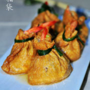 日式油豆腐皮、宁波年糕、玉米粒、青豆、包菜、大虾、猪肉末、小葱、高汤、鸡汁、盐、胡椒粉、米酒。