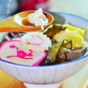 魔芋面、香菇、银杏、白水煮鸡蛋、鱼板、柴鱼昆布高汤。