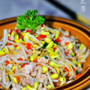 猪肉末、黄豆芽、红辣椒、葱、姜末、酱油、白糖、米酒、盐、鸡精、白胡椒粉。