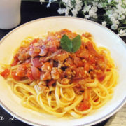 意大利面、肉沫、番茄、洋葱、大蒜。