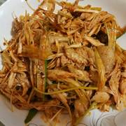 鸡胸肉、大葱、姜、红油辣椒、白糖、花椒面粉、芝麻酱、酱油。
