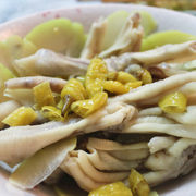 鸭蹼、佛手瓜、八角、桂皮、香叶、料酒、花椒、冰糖、泡椒、醋、姜片。