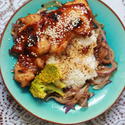 鸡腿、白米饭、洋葱、西兰花、白芝麻、生抽、老抽、蜂蜜、红糖、料酒。
