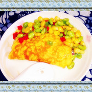 剩饭、咖喱土豆牛肉、鸡蛋、自发面粉、红椒、青椒、玉米粒、青豆。