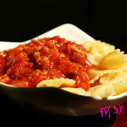 意面、猪肉末、洋葱、西红柿、番茄酱、黑胡椒粉、盐、糖、淀粉、罗勒。