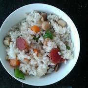 腊肠、青椒、胡萝卜、蘑菇、隔夜饭、盐、胡椒粉、味精。